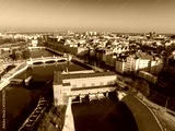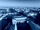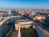 Aerial view of Wroclaw, Poland, showcasing the Oder River, Wroclaw Waterworks, arched bridges, colorful facades, and Wroclaw Cathedral spires.