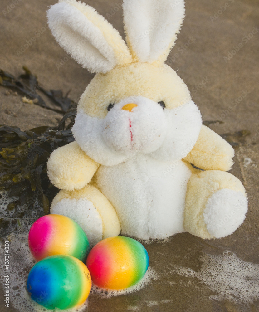 Easter concept, teddy rabbit with colored eggs on the beach, vacation.