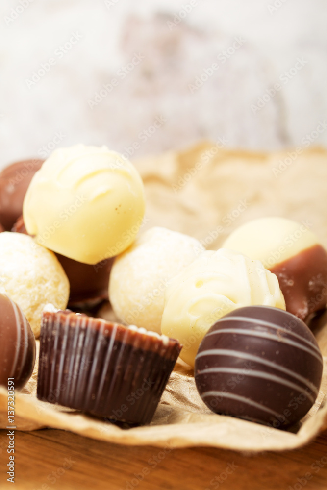 Selection of delicious chocolates on a rustic background