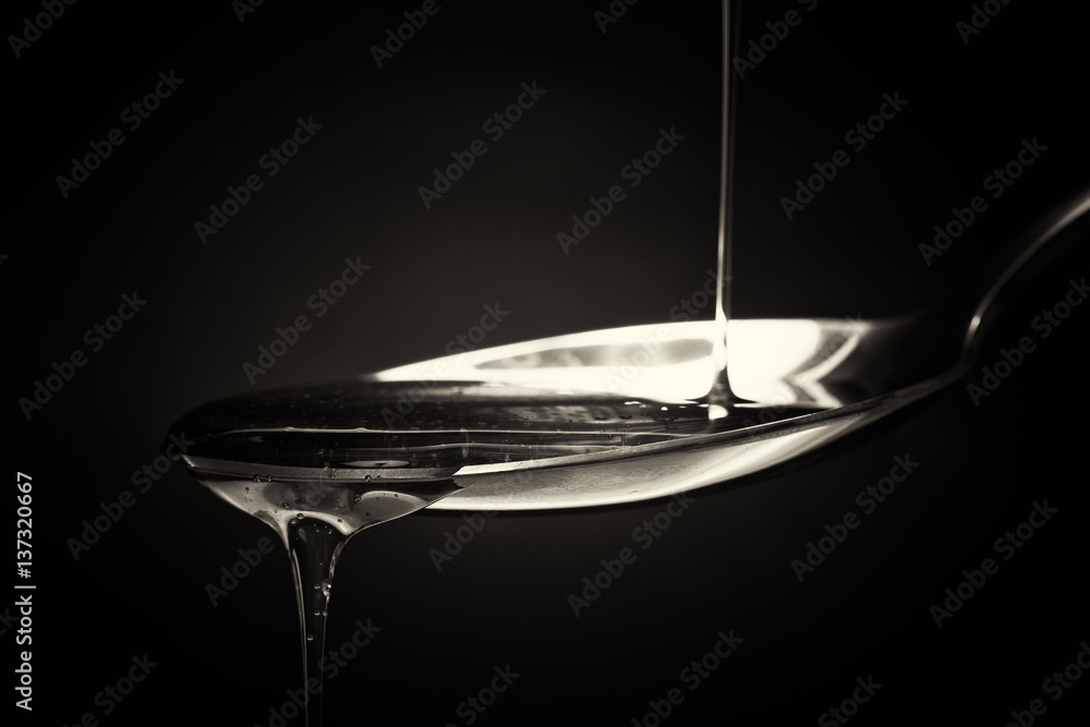 Honey pouring from spoon against a dark background