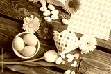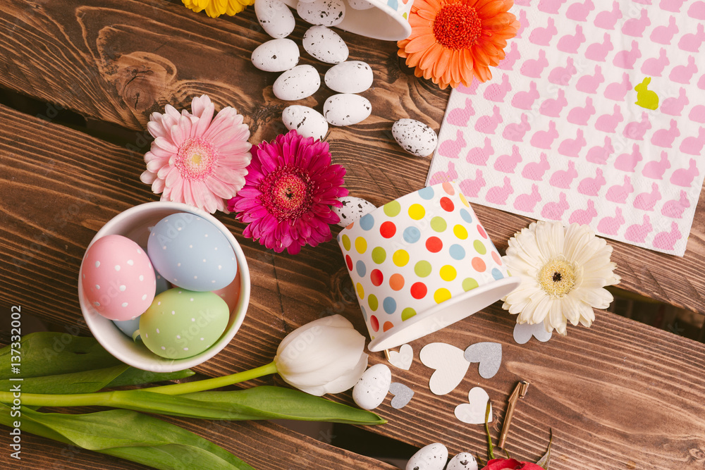 Easter flower arrangement and colorful eggs on a wooden surface