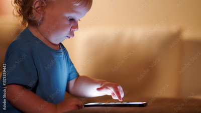 Small Baby pressing and scrolling with finger on phone touch screen. Cute Little child learns to use new internet technologies. Baby playing with cellphone, at home in the evening.