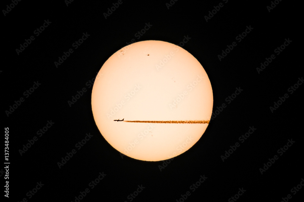 A jet plane and its vapour trail silhouetted as it passes the sun