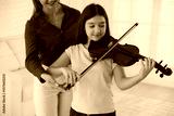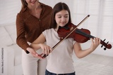 Woman teaching teenage girl to play violin at music lesson, closeup