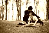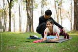 Man helping his partner during fitness exercise in a park. Healthy lifestyle concept