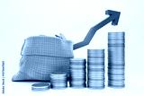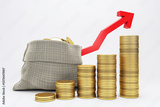 Stacked gold coins with red upward arrow and money bag on light background illustrating financial growth and investment concept. 3D Rendering