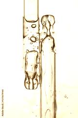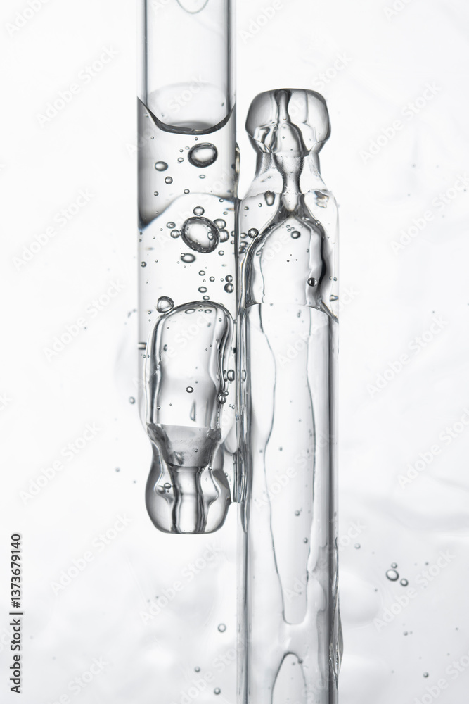 Two glass droppers with transparent serum, oil on a light background, top view. Cosmetic product for moisturizing and care, macro.