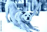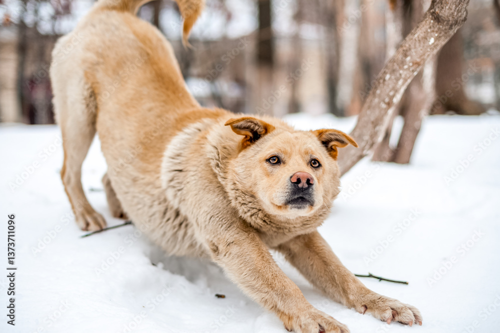 Non-pedigree stray dog stretching on snow