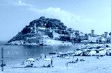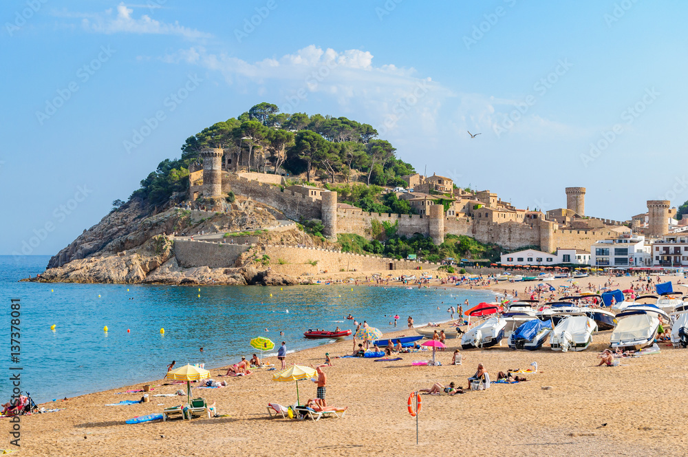A view of the ancient fortress of Tossa de Mar, in the foreground beach.