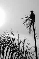 Sunset with the silhouette of a Southern caracara on a Palm tree. Pantanal, Brazil