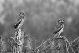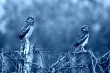 Two Burrowing owls sitting on a fence, facing, Pantanal, Brazil