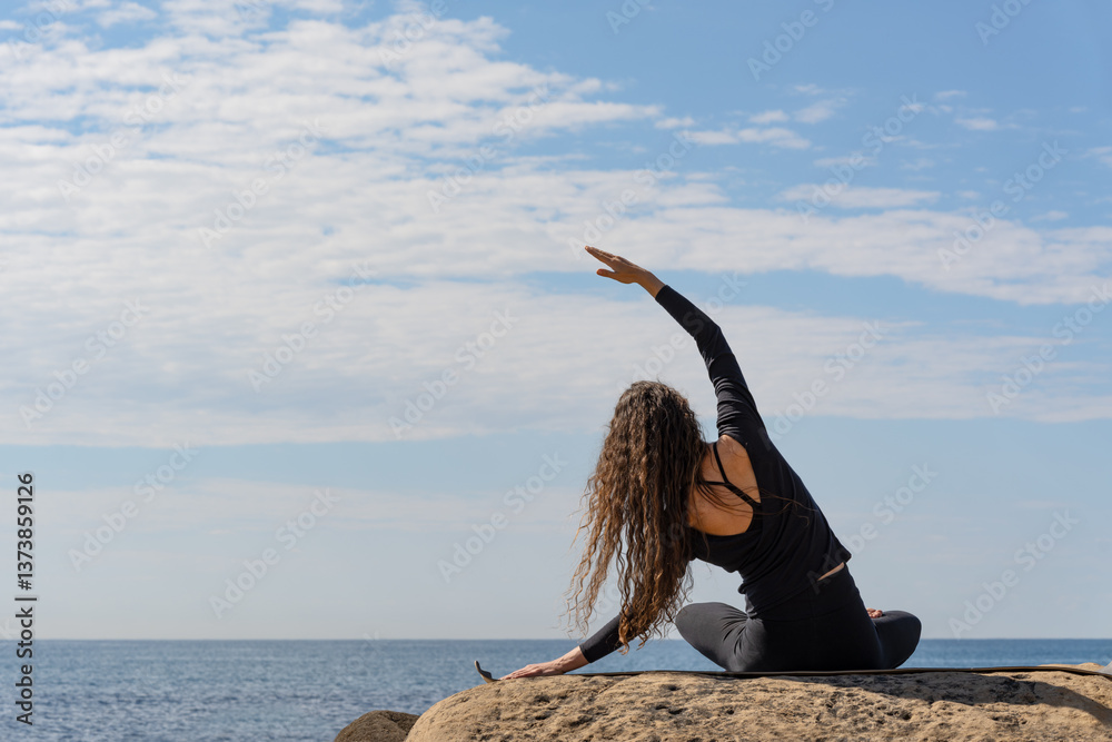 A woman doing yoga on a rocky shore the ocean. She wears black yoga attire, embracing mindfulness and tranquility. The peaceful sea and sky create a calming atmosphere.