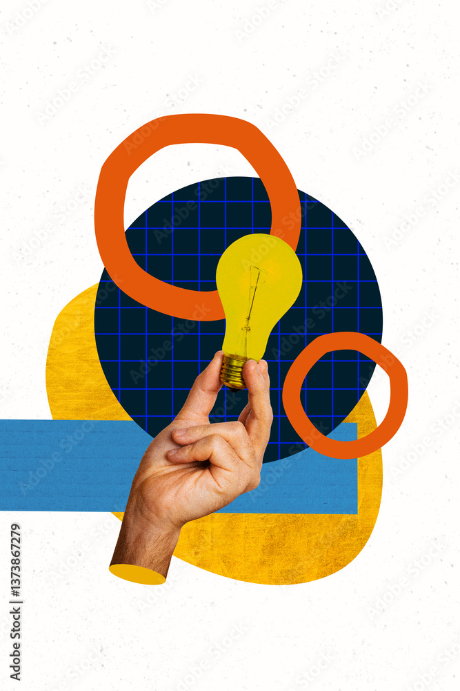 Exclusive creative art poster collage of hands electric hold bright light bulb blackout power idea finding enlightenment concept