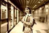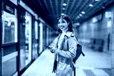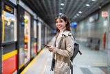 Smiling young woman using mobile phone in a public transport