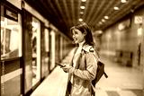 Smiling young woman using mobile phone in a public transport