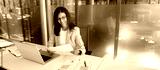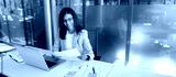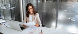 Latin business woman saleswoman working on laptop computer reading financial bank document in office workplace. Young manager businesswoman specialist doing paperwork using pc. Banner, copy space