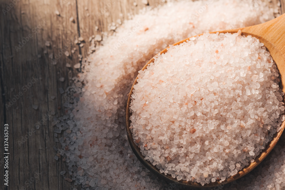 Himalayan salt. Close up of pink and orange coarse crystals in wooden spoon.