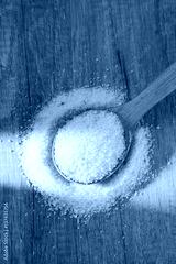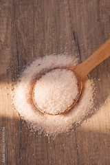 Himalayan pink rock salt in wooden spoon. Closeup. Sunny day