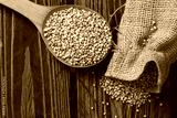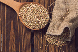 Buckwheat with wooden spoon near sack on wooden background. Close up. Top view.