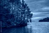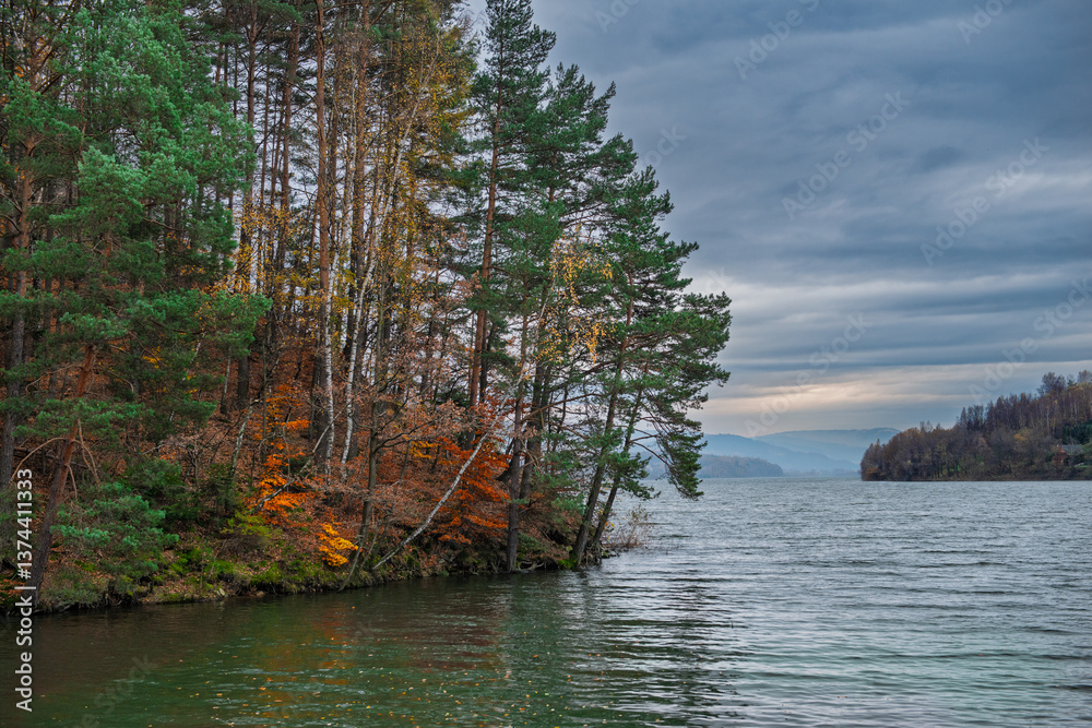 Krajobraz z górskim jeziorem w pochmurny jesienny dzień