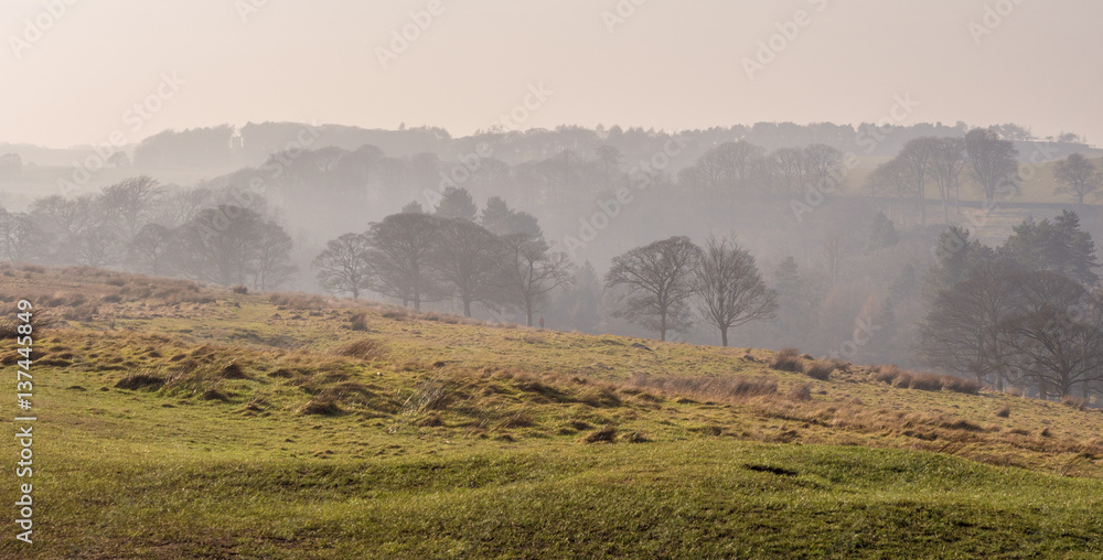 Treeline in winter mist on hillside at Lyme Park, Disley, Cheshire, UK