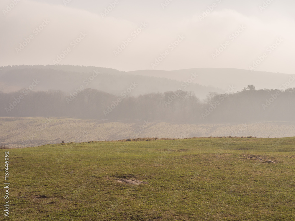 Treeline in winter mist on hillside at Lyme Park, Disley, Cheshire, UK