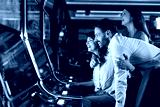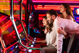 Group of Friends Enjoying Slot Machines in a Vibrant Casino