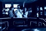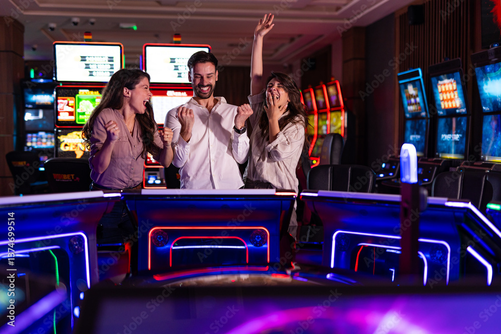 Friends Celebrating a Win at a Colorful Casino Arcade