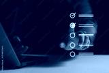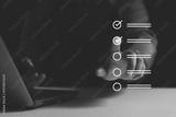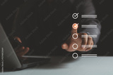 Businessman tick correct sign mark in checkbox for quality document control checklist and business approve project concept. Project acceptance assurance, assessment, evaluation, online exam survey.