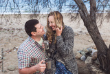 Happy couple drinking cocoa with marshmallows outdoors at the beach