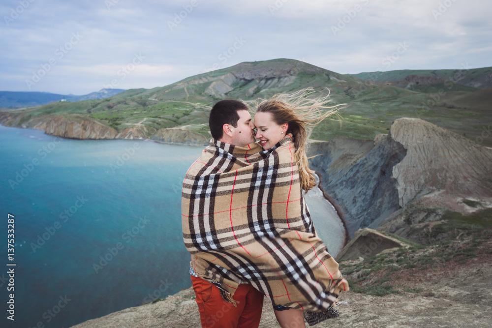 Сouple covered with a rug enjoying in the evening by the sea