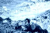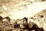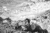 Man and woman in love standing on edge of cliff. Beautiful view of rocks and sea waves