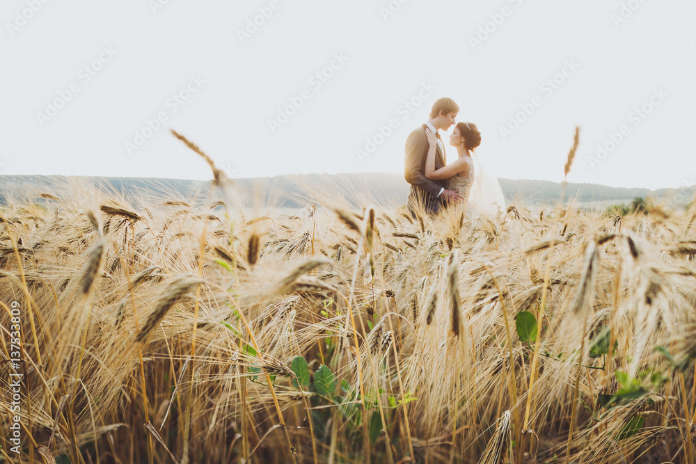 Loves couple in wheat field in sunlight. Romantic feelings at sunset