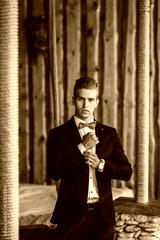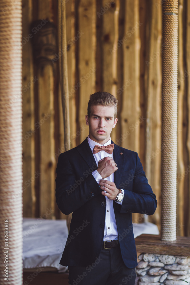 Portrait of elegant handsome man in black suit and bow-tie. Male fashion model