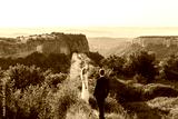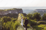 Wedding couple walking on the mountain edge with amazing view
