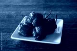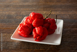 A view of a pile of Carolina reaper chili peppers on a plate.