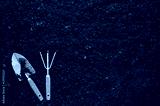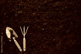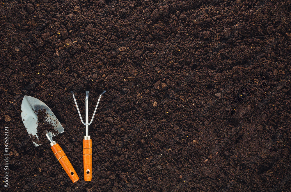 Gardening tools on fertile soil texture background seen from above, top view. Gardening or planting concept. Working in the spring garden.