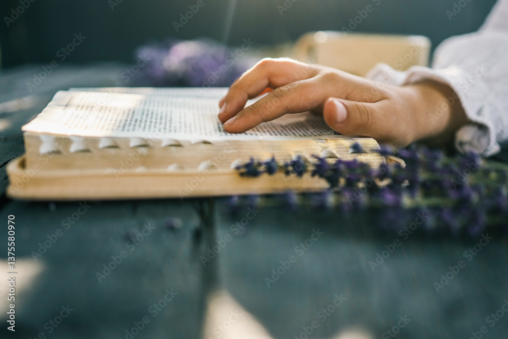 Child’s hands reading the Bible at a rustic table with a bundle of lavender and a cup of tea in the background. Peaceful morning devotion in natural light