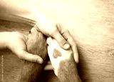 Dog paws with a spot in the form of heart and human hand close up, top view. Conceptual image of friendship, trust, love, the help between the person and a dog