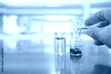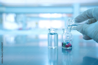 vials with capsule pill and water and scientist pouring hand in science laboratory