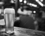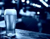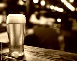 Glass of chilled beer on wooden bar table top and blurred bar interior at the background.