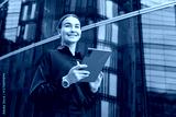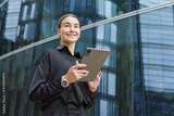 Young Professional Smiles While Using a Tablet in a Modern Urban Setting During Daytime Hours