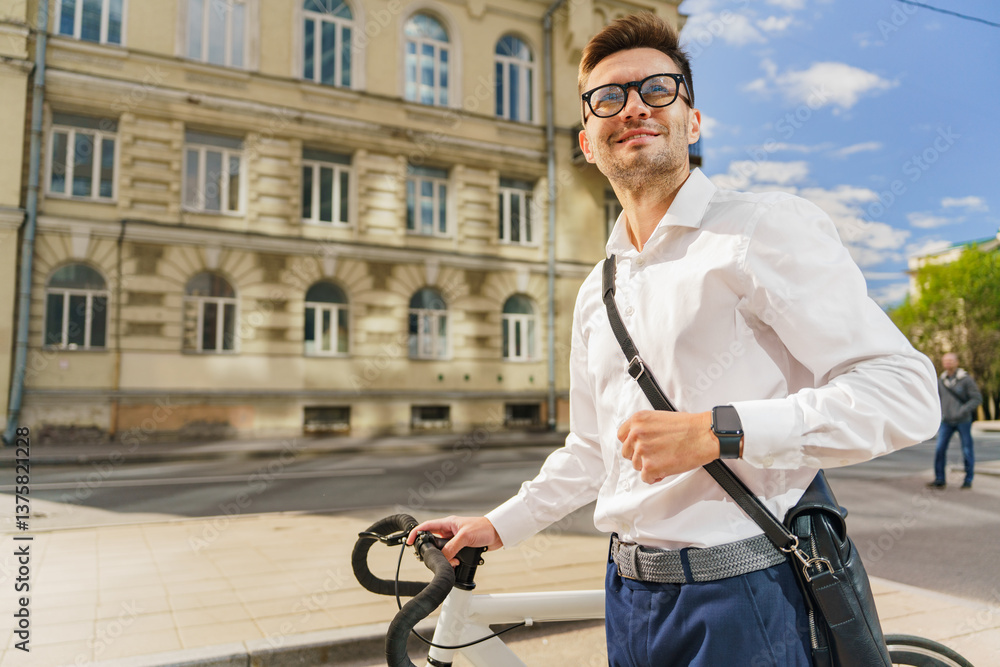 Young Man Enjoys Sunny Day While Strolling With Bicycle in Urban Setting, Exuding Confidence and Style