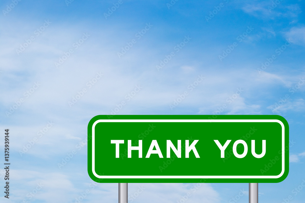 Green color transportation sign with word thank you on blue sky with white cloud background