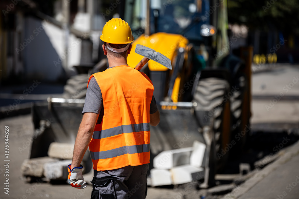 Construction worker prepares for roadwork during the day with heavy machinery in the background