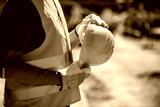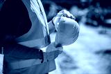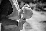 Worker in safety gear holds yellow hard hat at construction site during daylight hours