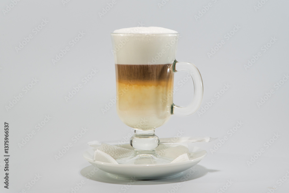 Glass mug of layered latte macchiato coffee with milk foam on white plate