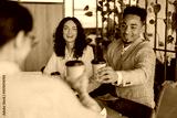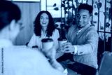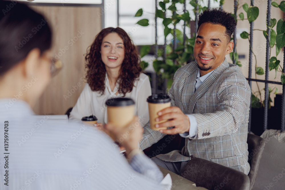 In a modern office, a friendly group enjoys coffee, fostering connection and collaboration among them