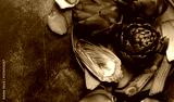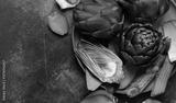 Plate full of cut purple raw artichokes top view. Fresh italian vegetables from farmers market
