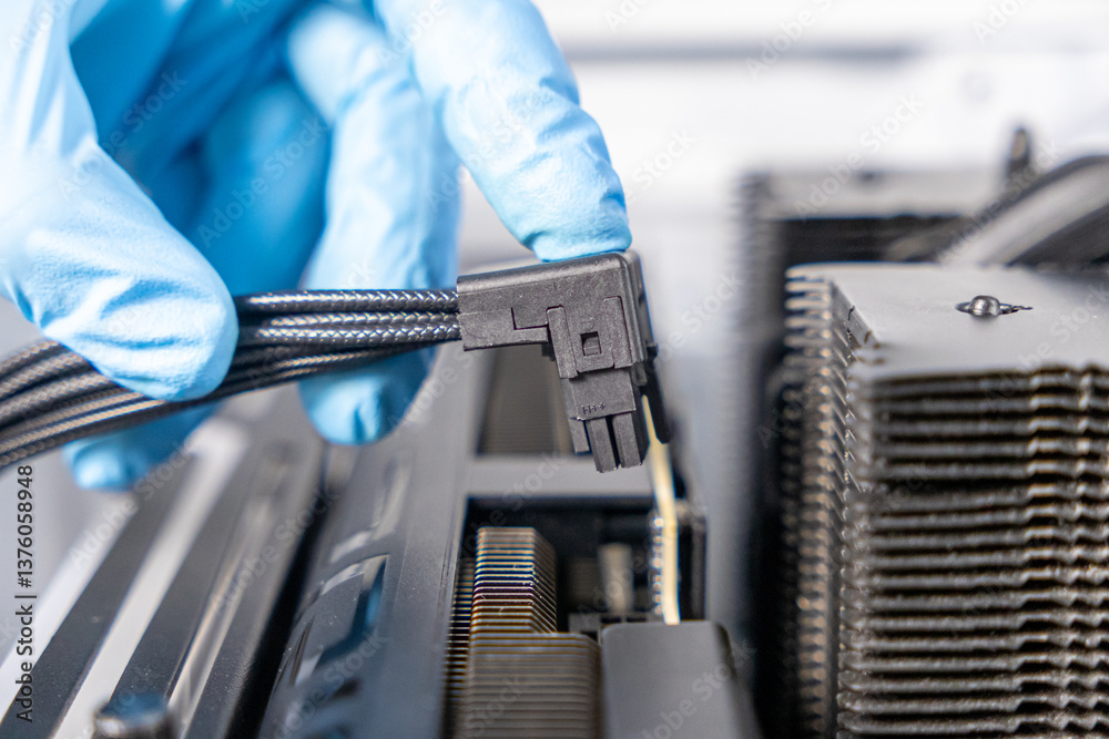 Technician in blue gloves positioning angled 16-pin PCIe power cable near graphics card socket during desktop PC hardware installation